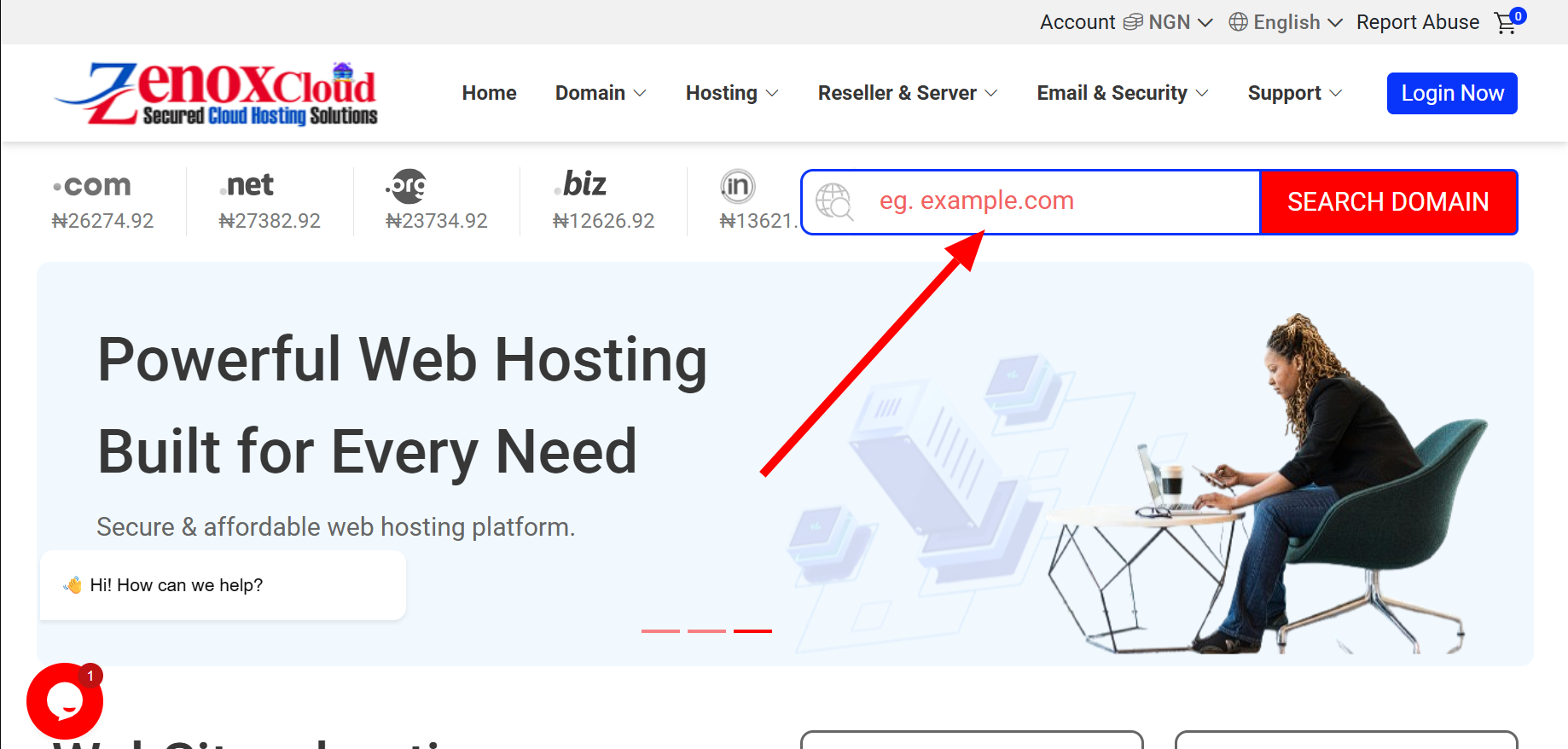 When the homepage loads, you will usually see a domain search box.