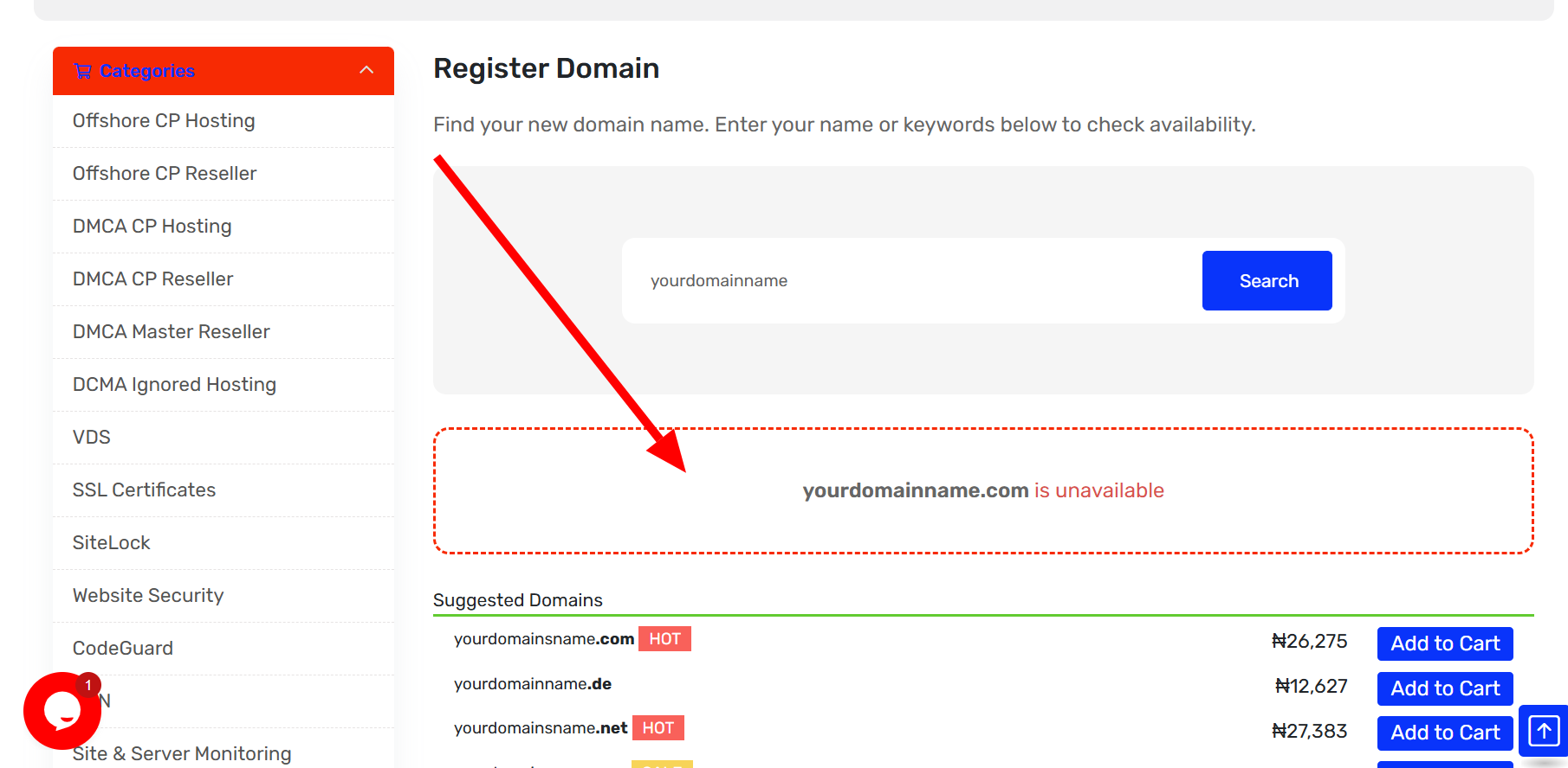 This search box allows you to check whether the domain you want is available.