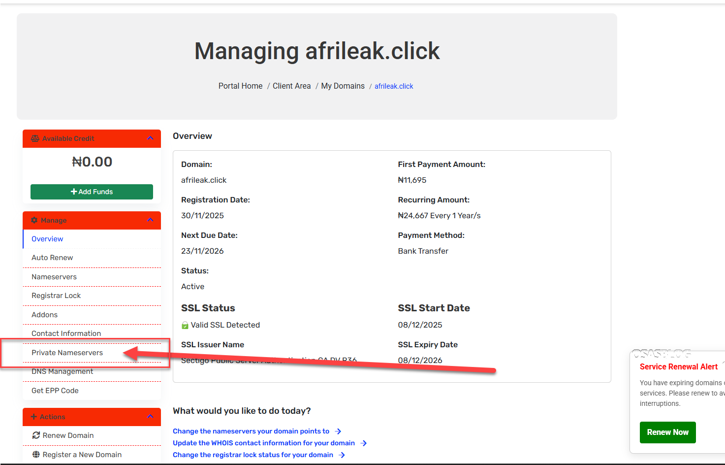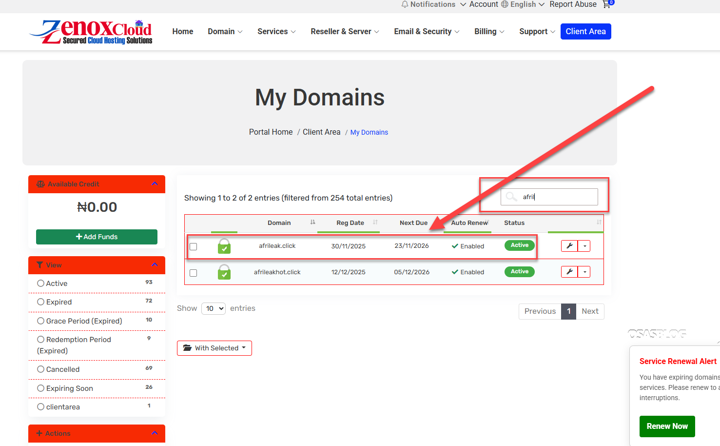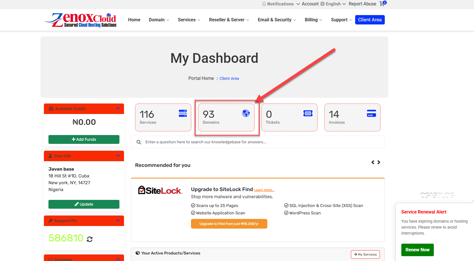 After logging in, you will see your client dashboard, where you can manage domains and hosting services.